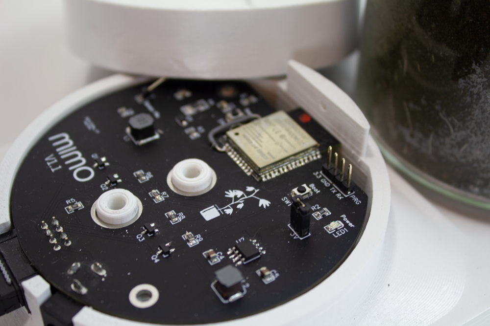 The prototype device is made primarily with PLA parts, smoothed and solvent welded with dichloromethane. The electronics are mounted on two fully custom printed circuit boards (one for the custom grow light, and one to host an embedded ESP32 controller). The device connects with IFTTT, which acts as an intermediary that allows Mimo to be connected to almost all smart devices including music players, smart plugs, and smart lights.
