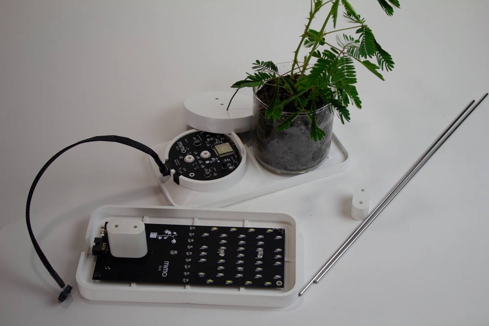 When touched, mimosa pudica plants respond by instantly drooping the affected leaf and folding its leaflets together. Mimo harnesses this natural feedback mechanism by recognizing touches and using them to control internet connected devices. For example, by playing or pausing music, or turning on and off smart lights. This action provides us with an exciting and fascinating way to reengage with everyday interactions, and encourages us to rethink the role of technology and nature in the human ecosystem.