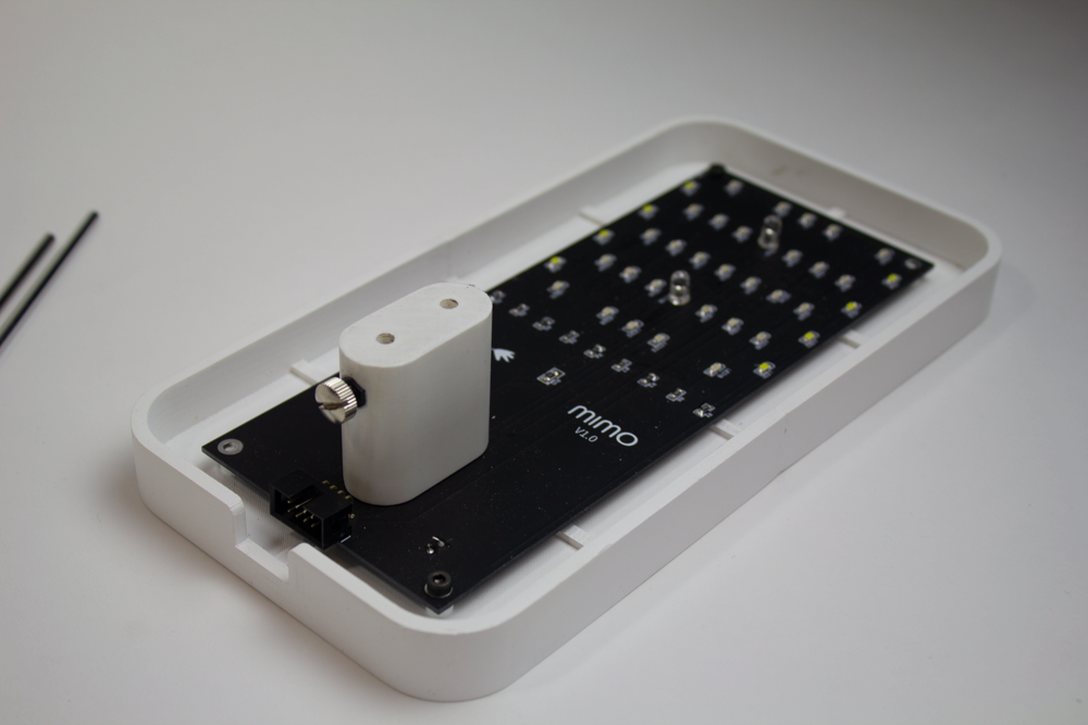 The far red light has another, special, role to play. Normally, a mimosa pudica will fold its leaves in dark conditions, in what is referred to as a 'nyctinastic response'. This response would normally make Mimo untenable in a home environment, where lights are constantly turning on and off. To counteract this, the device detects when the lights in the room are turned off, and briefly illuminates the mimosa pudica in far red light. This process creates a chemical change in the plant's phytochromes, causing the leaves to stay open, even after the far red light is turned off a few seconds later. In this state, the plant remains responsive to touch.