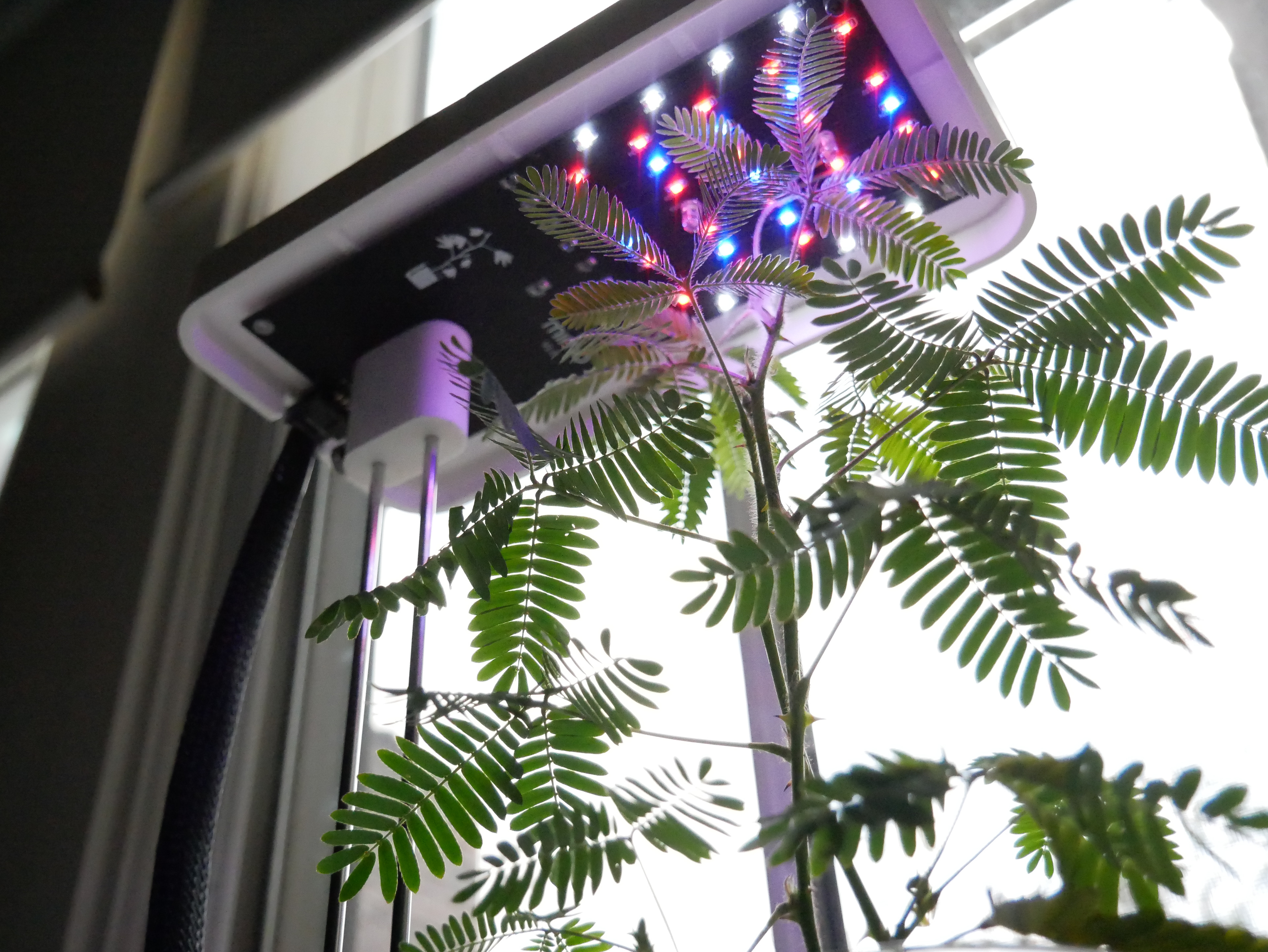 The custom, height adjustable grow light comprises four different colours of LED lights mounted on a custom circuit board. The four colours of light are white, blue, red, and far red, which can be controlled by a companion app. White light gives the plant a more natural look, while red, far red, and blue LEDs provide light across key bands in the light spectrum for optimal plant growth.